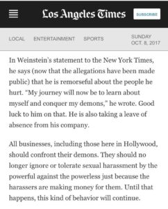 The argument here is that “Hollywood” has a problem. I think that’s an unhelpful way to frame the problem. Crowd psychology tells us that “diffusion of responsibility” is a real thing. When we say things like “Hollywood hurt me”, it shifts the problem from a an individual situation to a “structure”. Rather than “creating space for responsibility” this causes a diffusion of responsibility. When people cause problems and we aren’t able to bring person-to-person justice, we’re left with vague rages against ethereal opposition. “End Hollywood’s sexual harassment” isn’t as clear a prescription as “The Miramax board should fire Harvey Weinstein”.