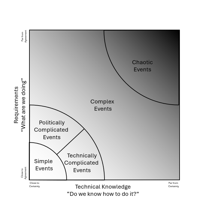 There are events that get far from certainty in both requirements and technical knowledge. Those are called “Chaos” events. We can lead those. It’s not hopeless. But it is a challenge.